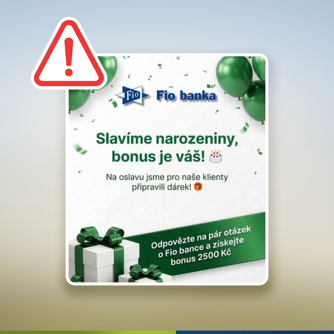 Zaznamenali jsme zvýšený výskyt podvodných kampaní na sociálních sítích, ve kterých se neznámé osoby vydávají za naši banku. Tyto reklamy nebo příspěvky zpravidla slibují odměnu za vyplnění několika otázek. Upozorňujeme, že se jedná o PODVOD. Fio banka žádnou takovou akci nepořádá.