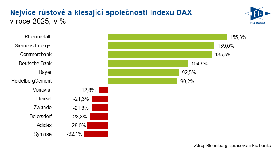 Index byl tažen především zbrojařskou společností Rheinmetall (+155,3 %), které nadále dopomáhá vzrůstající geopolitické napětí a s tím spojené zvýšení obranných výdajů zemí NATO. Úspěšný rok zaznamenala i energetická společnost Siemens Energy (+139 %), která profitovala z rostoucí globální poptávky po elektřině, a to ve spojitosti s nástupem umělé inteligence a potřebě stavby datacenter. Silnou výkonnost měly rovněž akcie německých bank, Comerzbank (+135,5 %) a Deutsche Bank (+104,6 %). Na opačné straně spektra zakončily rok společnosti Symrise (-32,1 %), Adidas (-28 %) a Beiersdorf (-23,8 %).