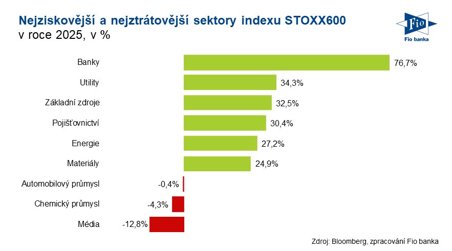 Index STOXX Europe 600, který zahrnuje 600 největších společností z 17 evropských zemí napříč všemi sektory, za rok 2025 zhodnotil, po započítání dividend, o 20,7 %. Většina sektorů skončila za daný rok v zisku, přičemž zdaleka nejvíce vzrostl sektor bank a to o 76,7 %. Významně se dařilo také sektorům utilit (+34,3 %) či základních materiálů (+32,5 %). Naopak ve ztrátě skončily pouze sektory médií (-12,8 %) a chemický (-4,3 %), zatímco automobilový sektor včetně výrobců náhradních dílů oslabil o nepatrných 0,4 %.