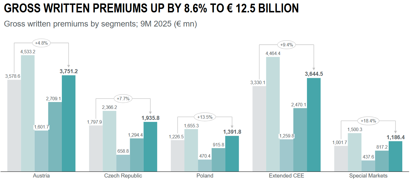 Rakouská pojišťovna Vienna Insurance Group zveřejnila výsledky hospodaření za prvních devět měsíců roku 2025. Společnost zaznamenala meziroční růst hrubého předepsaného pojistného o 8,6 %, zisk před zdaněním vzrostl meziročně o 31 %. Společnost v celém roce očekává zisk před zdaněním v rozmezí 1,10 až 1,15 mld. EUR.