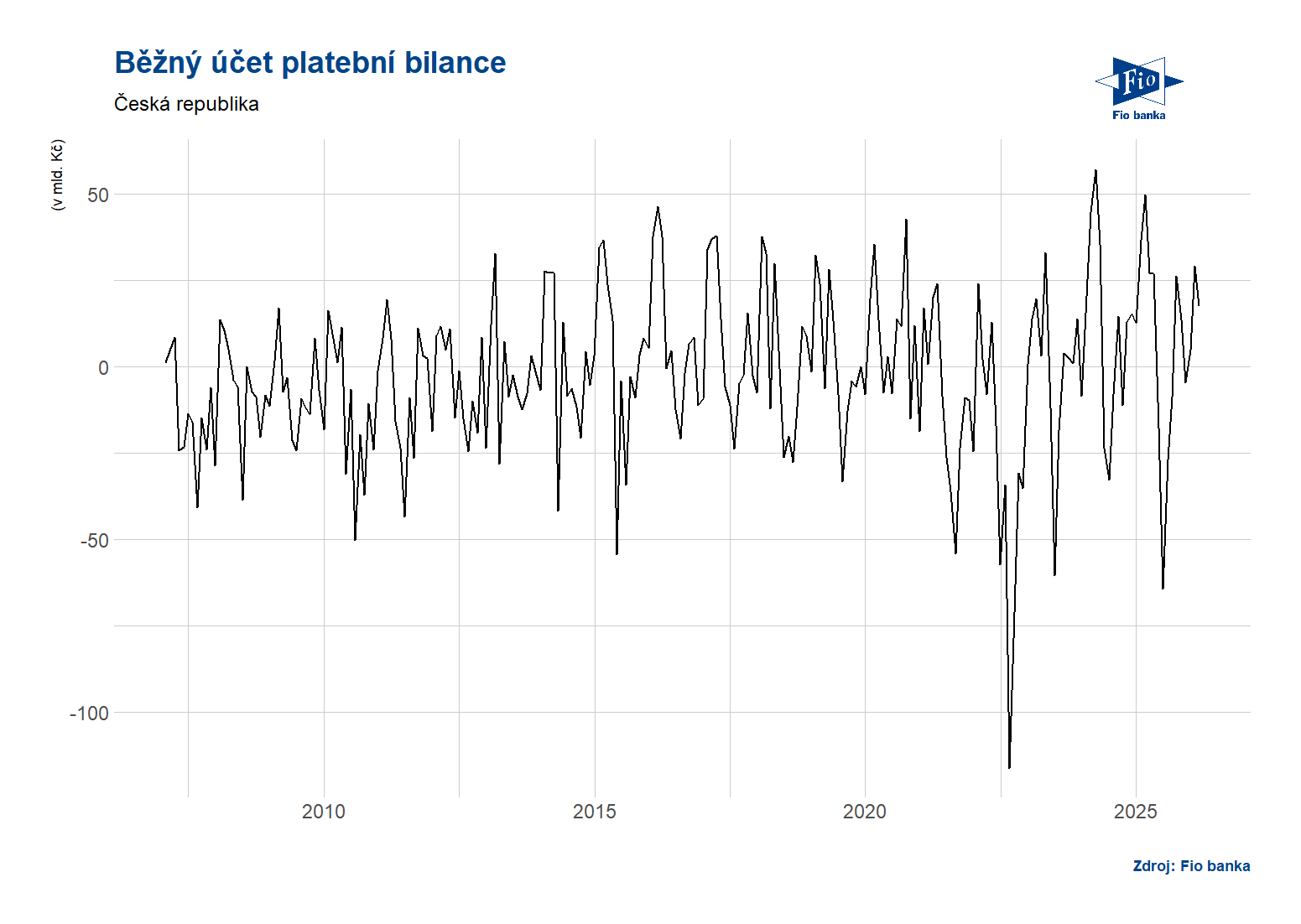 ČR: Běžný účet platební bilance v únoru v přebytku 17,37 mld. Kč při očekávání 29,40 mld. Kč