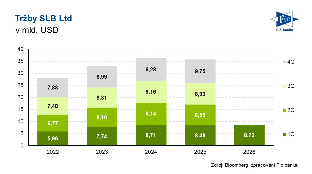 Tržby ve 1. čtvrtletí meziročně vzrostly o 2,7 % na 8,72 mld. USD při očekávání trhu 8,66 mld. USD. Společnost SLB ve třetím kvartále minulého roku akvírovala společnost ChampionX, která v tomto kvartále přispěla k tržbám částkou 838 mil. USD.
