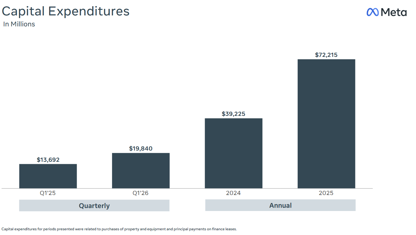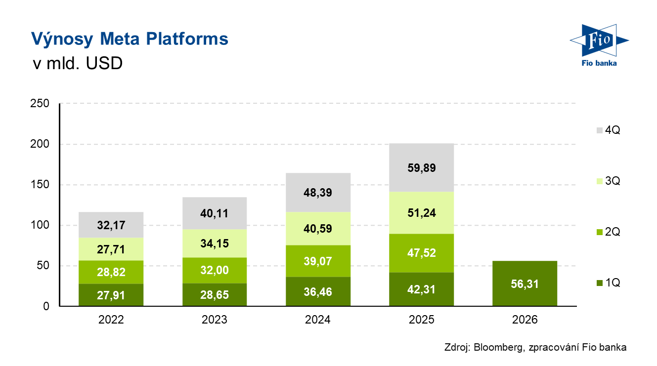 Americká společnost Meta Platforms, provozovatel sociálních sítí Facebook, Instagram a dalších, zveřejnila ve středu po uzavření trhu hospodářské výsledky za první čtvrtletí roku 2026. Jak výnosy, které meziročně vzrostly o 33 % na 56,31 mld. USD, tak i zisk na akcii překonaly odhady analytiků. Solidní čísla však podle analytiků zastínil zvýšený výhled kapitálových výdajů, který mezi investory vyvolal obavy z rostoucích nákladů spojených s rozvojem umělé inteligence.