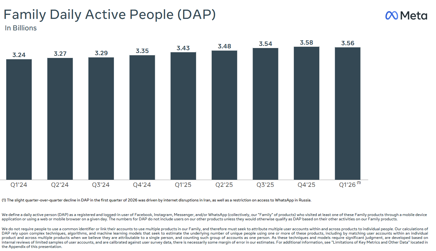 Průměrný denní počet uživatelů služeb ze skupiny Family of Apps dosáhl 3,56 mld., což představuje meziroční růst o 3,8 %. Trh očekával čekávání úroveň 3,61 mld.